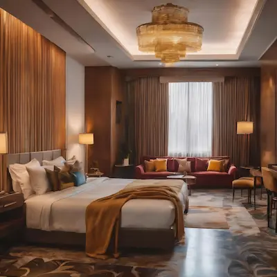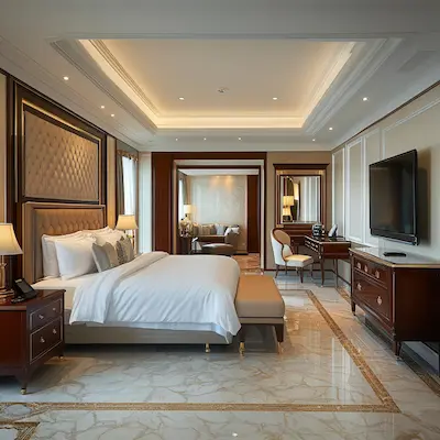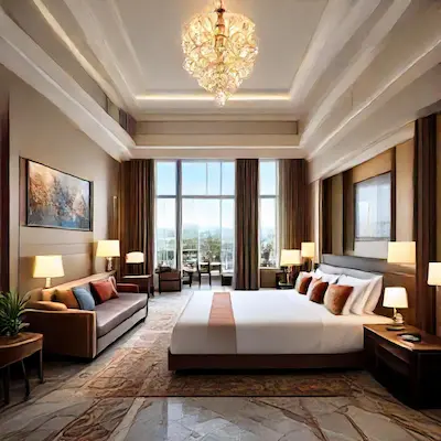 Designed for comfort and value, the Deluxe Room features a cozy window lounge, plush bedding, and thoughtful storage. Neutral tones and soft textures make it perfect for business or leisure stays. Freshen up in the modern bathroom and unwind with your favorite shows after a day out.